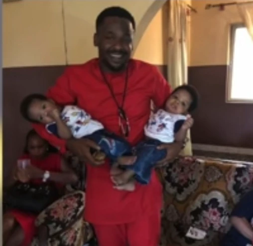 Sometimes ago, pictures of Zubby Michael carrying a set of twin children went viral on the internet. A lot of people speculated there were his children. However, the truth is the twin children are his younger sister’s. See pictures of his sister, her twin children, and husband below.